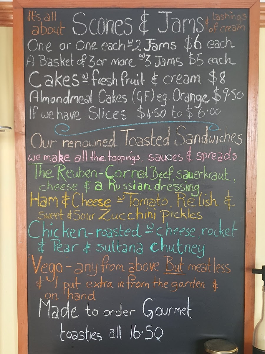 The menu at Bruthen Tearooms offers a selection of light meals and beverages suitable for casual dining, coffee breaks, or light lunches. It includes a variety of toasted sandwiches with options such as Reuben, Ham & Cheese, Chicken, and vegetarian choices. Alongside these, scones are available either individually or in pairs, often served with a range of homemade jams.